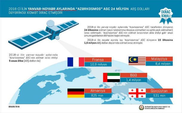 2018-ci ilin yanvar-noyabr aylarında “Azərkosmos” ASC tərəfindən dünyanın 24 ölkəsinə 24 milyon ABŞ dolları dəyərində xidmət (peyk telekommunikasiya xidmətləri və optik peyk xidmətləri) ixrac edilib.