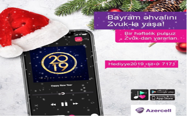 Yeni il ərəfəsində “Azercell Telekom” MMC abunəçilərinə özəl kampaniya təqdim edir. Belə ki, 30.12.2018 – 05.01.2019 tarixləri arasında ZVUK-dan (onlayn musiqi tətbiqi) ilk dəfə istifadə edənlərə Yeni il hədiyyəsi olaraq Azercell 7 günlük Premium abunəlik təqdim edəcək. Şirkətin yeni il hədiyyəsindən yararlanmaq üçün Hediyye2019 yazıb 7707 qısa nömrəsinə göndərmək lazımdır. Zvuk xidməti istənilən musiqini dinləmək və yeni musiqi parçaları əlavə edərək abunəçilərə öz play listlərini yaratmaq imkanı verir. Xidmətə qoşulmaq üçün Google Play və ya AppStore-dan mobil tətbiqi yükləmək, qeydiyyat üçün tətbiqdə mobil nömrəni daxil edib, əvəzində SMS vasitəsilə gələn unikal kodu təkrarən mobil tətbiq üzərindən əlavə etmək lazımdır. Abunəçilər Azercell Telekom MMC tərəfindən təqdim edilən xidmətlər, tariflər və keçirilən kampaniyalar barədə ətraflı məlumatları rəsmi internet səhifəsindən (www.azercell.com), həmçinin Müştəri Xidmətlərinə (MX ofisləri, həftənin 7 günü 24 saat ərzində fəaliyyət göstərən Telefon Mərkəzi — SimSim abunəçiləri (012) 4904949/2002, Fakturalı xətt abunəçiləri (012) 4905252/6565,