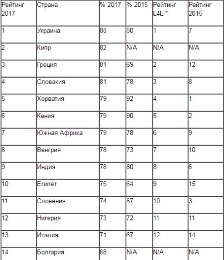 Elchi.az xəbər verir ki, sorğuda 41 ölkənin əhalisi iştirak edib. Ukrayna reytinq cədvəlində korrupsiyanın ən çox yer aldığı ölkələr arasında birinci olub. Ukrayna əhalisinin 88%-ni bu ölkədə korrupsiyanın olduğunu təsdiqləyiblər.