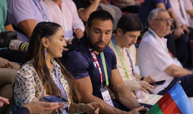Leyla Əliyeva güləşçilərin çıxışlarını izləyir